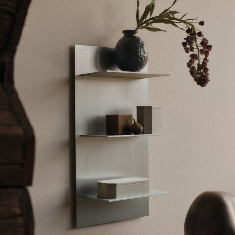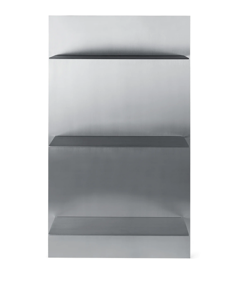 Crafted from aluminum and referencing industrial and brutalist aesthetics, the Lager Wall Shelf offers sleek, functional storage to any space. Its design facilitates simple wall installation using a French cleat hanging system, and the uniform spacing between sections allows for the stacking of multiple shelves, perfect for a cohesive and tall library display.