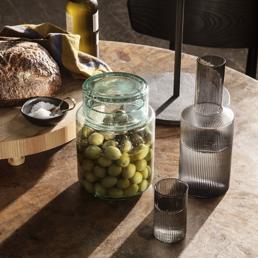 A companion to the Ripple Carafe, this elegant glass functions as both a drinking glass and lid. Inspired by small, delicate glasses traditionally used in French cuisine to serve little appetisers and desserts, the mouth-blown glass has a rippled surface that is distinctive to the series. Please note: The Ripple Carafe is sold separately
