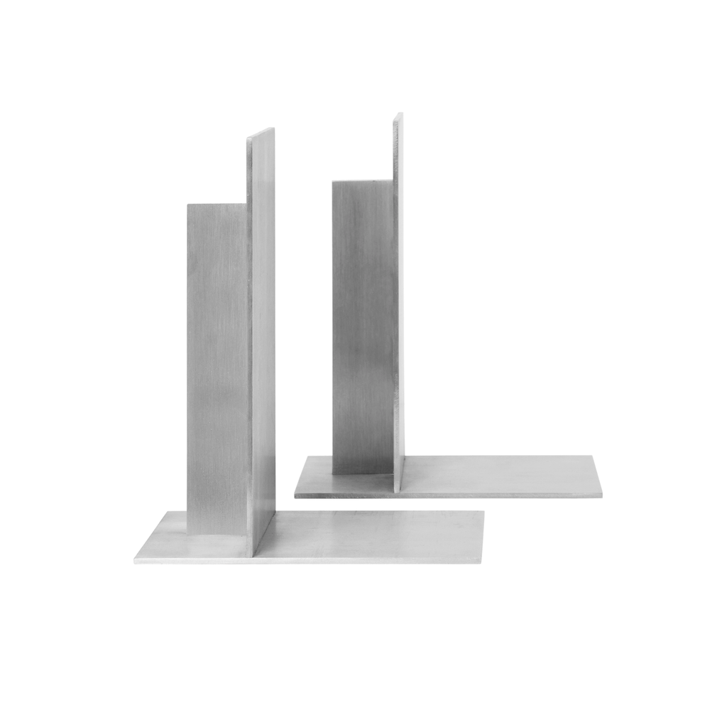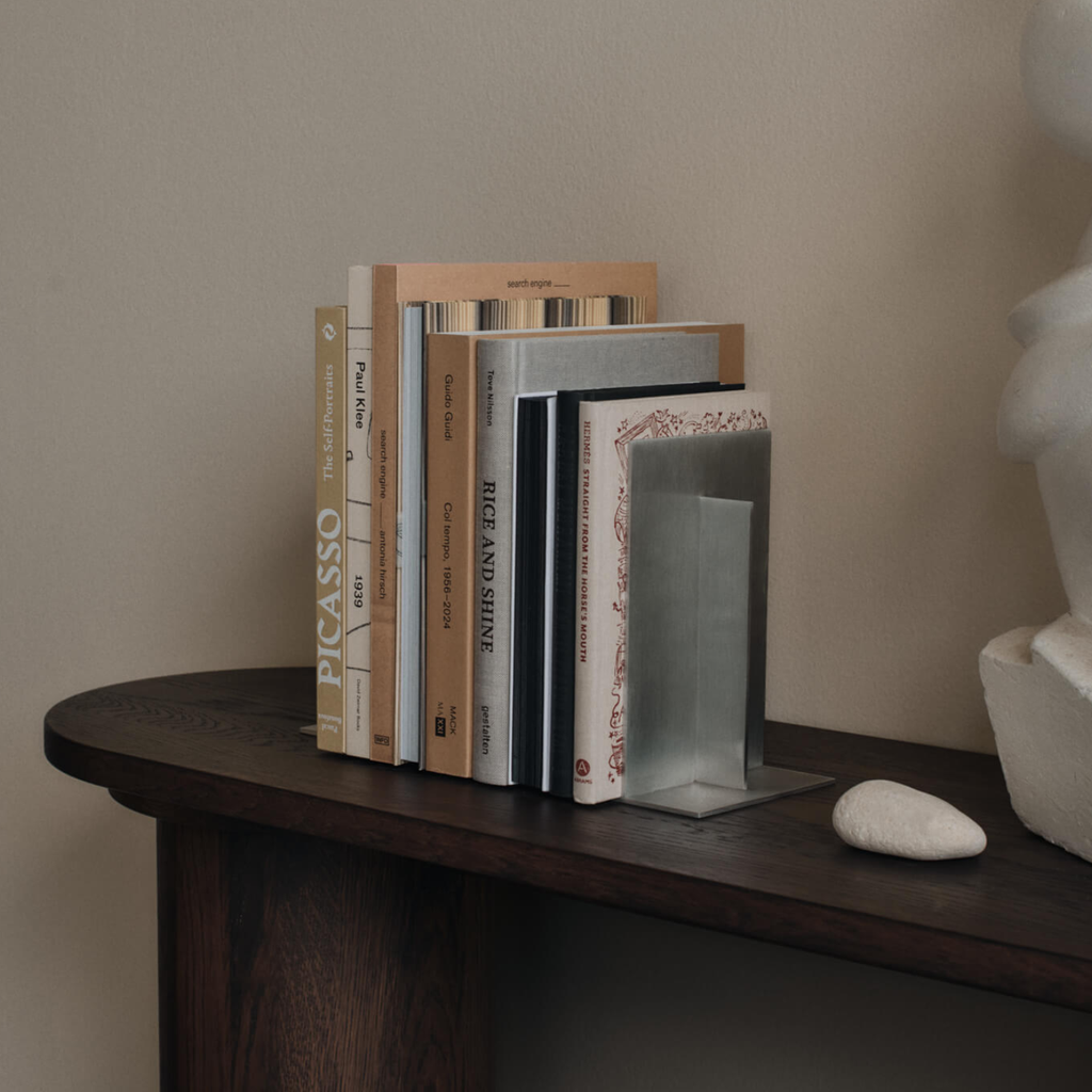 The Lager Bookends come as a set of two, crafted from brushed aluminium with a clean, industrial expression. Their bold, geometric form adds a sculptural element to shelving while keeping books neatly in place. Whether used functionally or styled as decorative accents, the bookends bring a sense of structure and quiet strength to your space.
