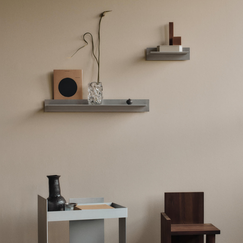 The Lager Wall Shelf in its single horizontal format offers a clean and considered approach to wall-mounted storage. Crafted from brushed aluminium with subtle industrial cues, it serves as a minimal solution for displaying glassware, objects or everyday items.