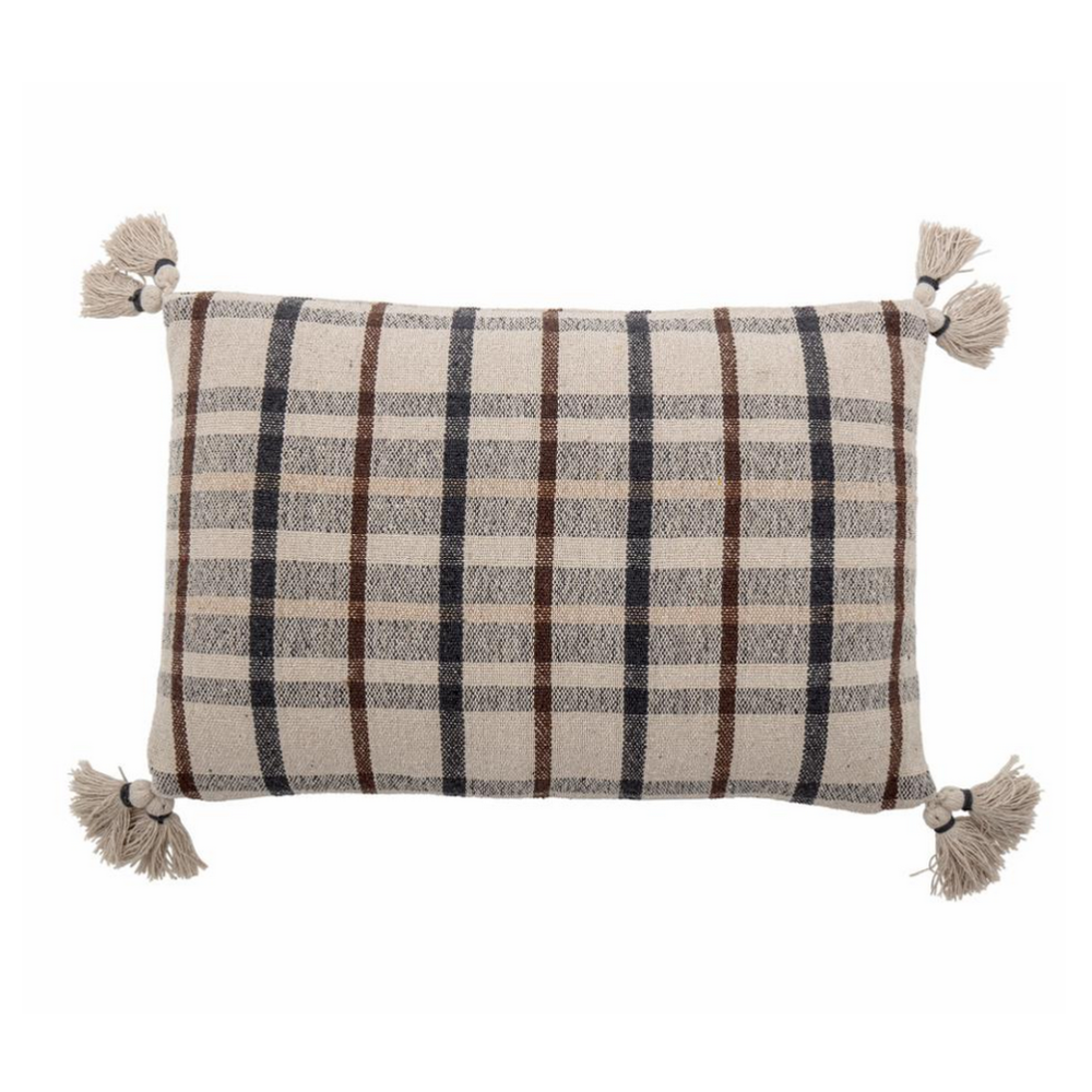About the product This cushion is woven in in natural coloured and recycled cotton. It's is woven into a detailed pattern in lowkey colours that won't steal the attention but contribute to the homely and cosy feeling your living room, bedroom or wherever you place this cushion. The tassels in the corners add to the cosy feeling this cushion brings into your home.