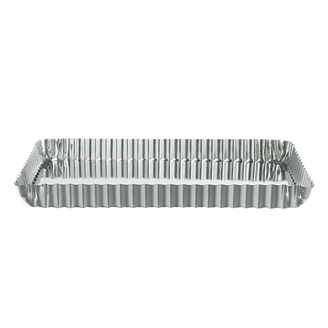 Praktískt ferhyrnt bökuform úr tini með lausan botn sem gerir það auðvelt að lyfta tilbúnum bökum úr forminu.