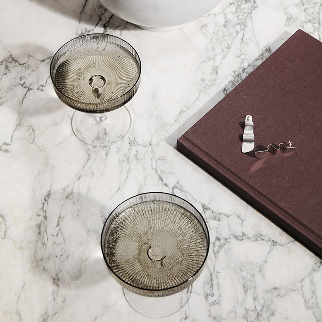 Featuring a beautifully rippled surface the set of Ripple Champagne Saucers presents a tinted glass in a classic design for sparkling wines. They are made of delicate tinted glass mouth-blown into the mould, adding a dynamic and energetic expression to the glasses. Every glass is mouth-blown and made with love, so variations can occour.
