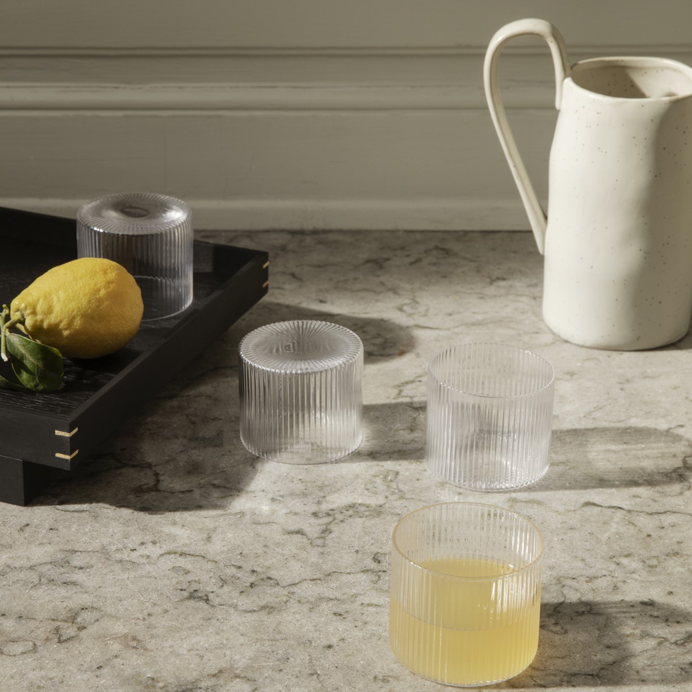 Mouth blown into the mould, this set of four low glasses features a distinctive, beautifully rippled surface. The vertical lines add a strong and sophisticated look to their understated, classic form and are perfect for casual dining. Pair them with other pieces in the Ripple glass collection for a unified dining experience.
