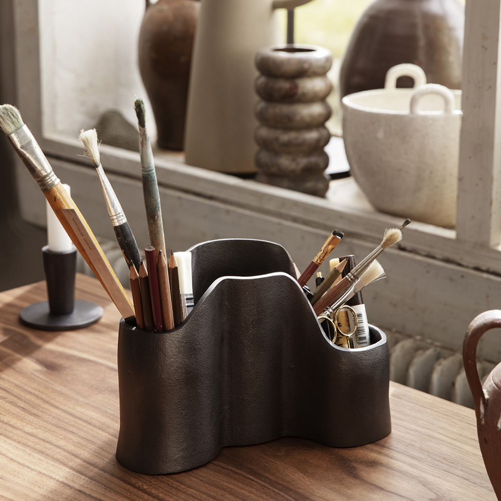 Named after the Japanese word for mountain, the Yama Pencil Holder is a sculptural yet functional piece that is inspired by wild, untamed landscape. Made from recycled casted aluminum, the Pencil Holder features a rough, matte finish that contrasts its fluid and organic silhouette. With three different compartments in varying heights, the Yama Pencil Holder is ideal for stationary but can just as easily be used for storing kitchen utensils, make-up or other bathroom essentials.