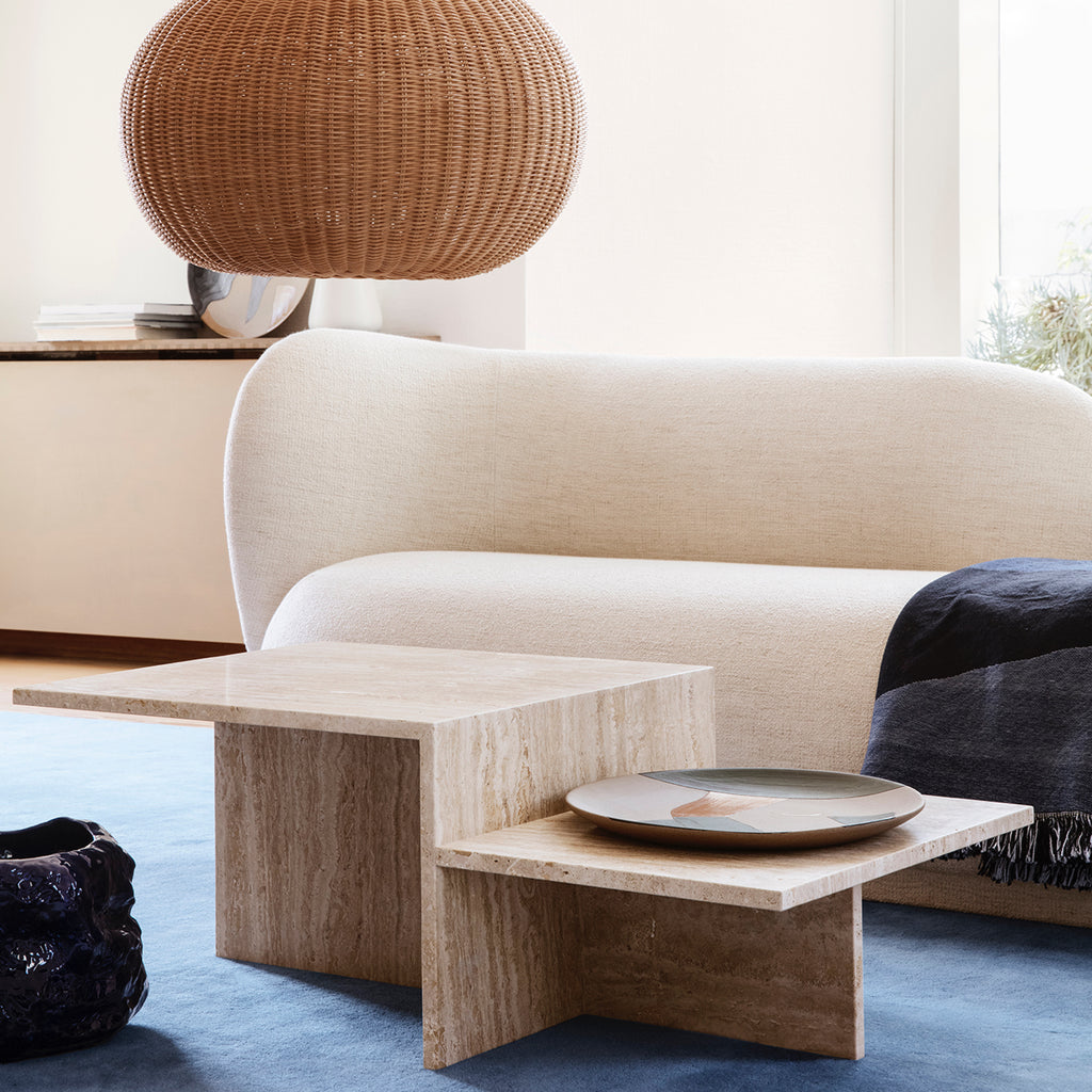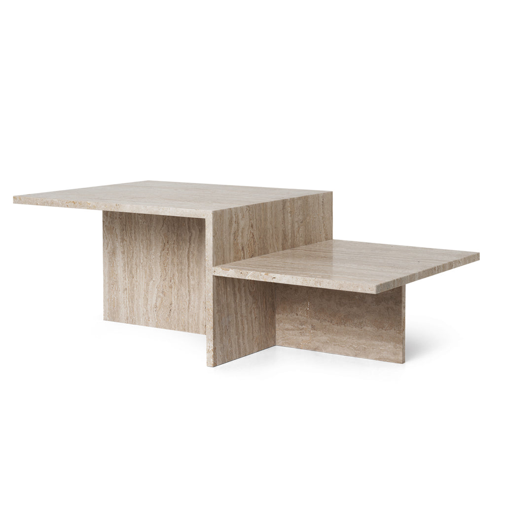 Originally inspired by Japanese minimalism, the Distinct Coffee Table explores the creation of complex structures based on a single element. The minimalist construction creates a contrast to the richness of the travertine's earthy textures. With the natural and diverse qualities of the sand-coloured limestone, it provides rawness and tangibility that highlight the architectural character of the furniture piece.