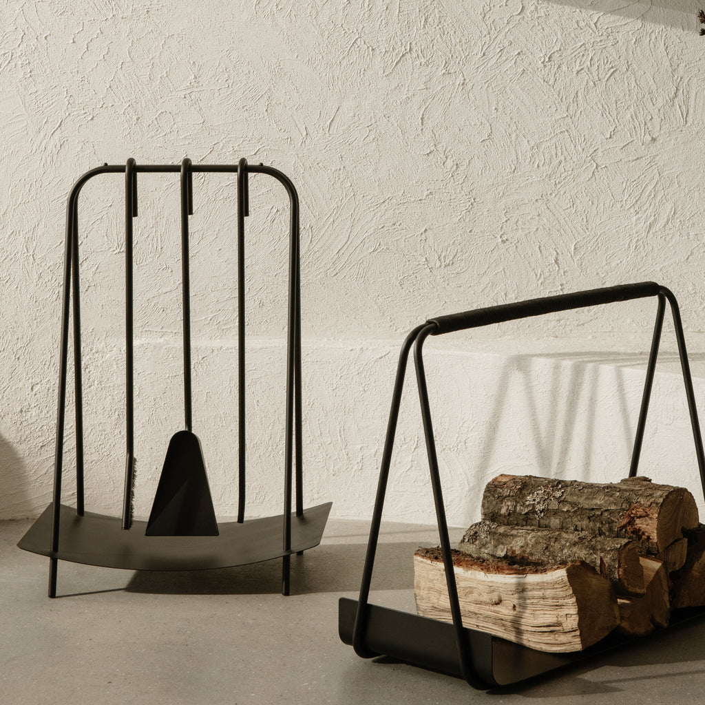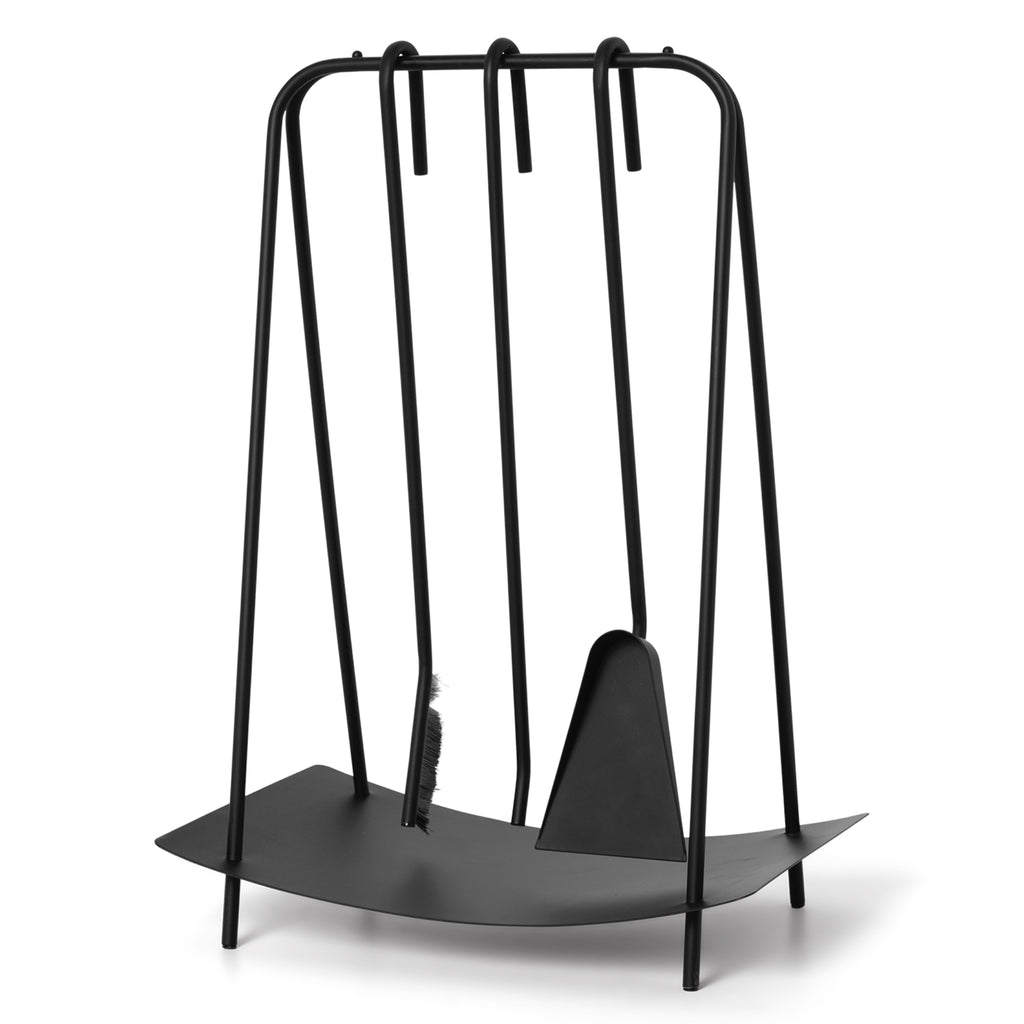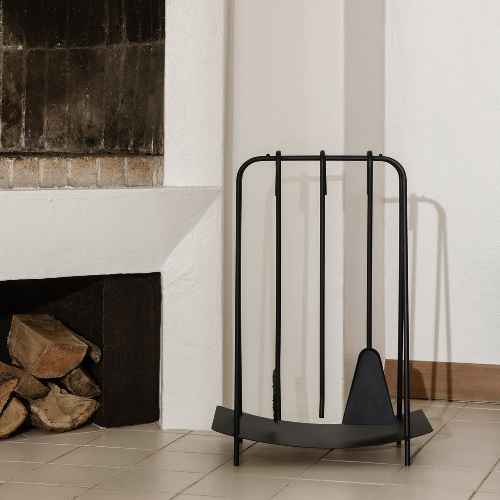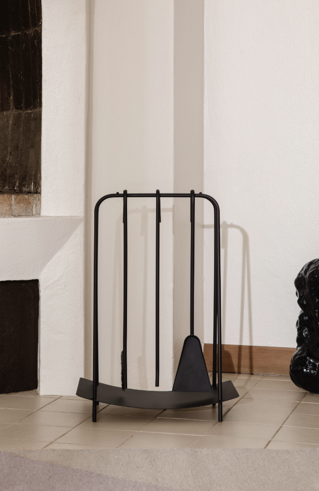 Inspired by jewellery, this set of tools brings out the best of your fireplace. With organic shapes and delicate lines, the powder coated steel ensemble helps you tend to the fire in style. Merging functionality and aesthetics the set lightens up the area around your hearth or fireplace. The set includes a stoker, spade, a broom, and the stand. Available in black and brass.