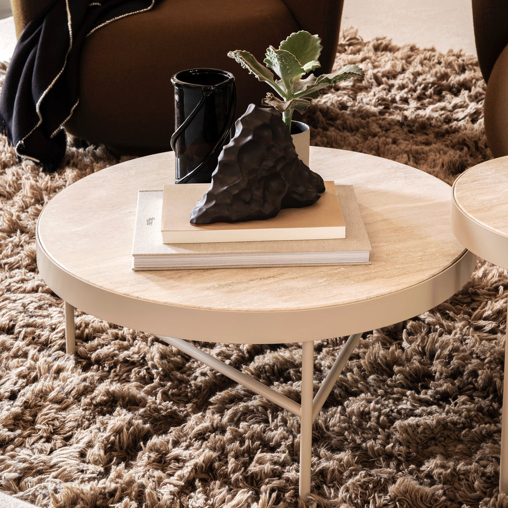 This versatile Travertine Table is a functional and beautiful addition to your home. The travertine tabletop has an earthy texture with rich, natural detailing, and is beautifully contrasted by the industrial expression of the powder-coated metal frame. Please note: As travertine is a natural material, slight variations from product to product may occur.
